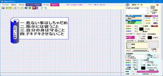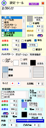 ![]() 6種類のカラーリング、8種類の形状、4種類の配置ができます。 デザイン領域は、A4横サイズです。ペイント、切抜きの機能が付きました。